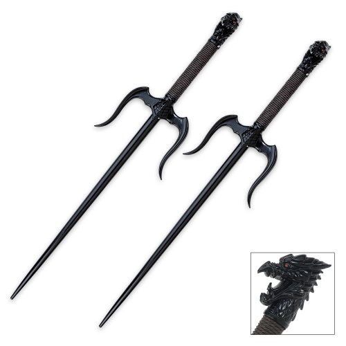 You only thought you had all the ninja weapons until now. This twin sai set is one for the ages. You'll never find a more detailed pommel than the cast dragon skull with vicious red eyes, cord-wrapped handle and the hand guards are its wings. At 19" overall, this is one set of twins you don't want to mess with.