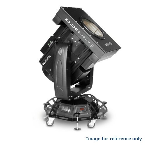 One of a number of new additions to the wide range of exterior architectural projectors, the KOLORGLOBE 4000 is a MOVING HEAD ultra high power CYM narrow variable single beam color changer searchlight. This concept in such a high lamp power fixture is almost unique and the combination of moving beam and color change provides a truly spectacular display that would be a highlight for any permanent or temporary event. Kolorglobe shares the same lamp and color change assembly as the static beam Kolorjet, and uses the same Xenon 4000W flicker free lamp with nickel rhodium plated reflector to give an extraordinary light output, further enhanced by the narrow angle beam, zoomable electronically between 1 and 16. The CYM color mixing system gives an enormous range of color hues, and the unit is weatherproofed to a certified IP44 rating and so is specifically designed for exterior use. The base unit features brake locking wheels and screw jacks for leveling (assisted by on board spirit level) and stabilizing the unit, transit locks are provided for the pan and tilt movement and the unit is designed for reliability even in tough use, being built from aluminum and galvanized steel with scratch resistant textured polyester black finish. The high technology lamp and color changing/zoom optics section from the Kolorjet is already proven, but the same attention to detail has been paid to the new base unit, and, for example, brush less servo motors are used for the pan and tilt movement to ensure high reliability and precision. On board or remote DMX512 gives access to all functions, which include frost soft edge effect, black out, dimmer, strobe and standby. Although it is likely that this unit will normally be run by external DMX (8 channels required), on board pre-programmed colour sequences plus a movement demo programmer means that the unit could be used stand alone.