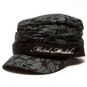 You've got that feminine swagger that all those conservative girls wish they could pull off. Add some more funk to your MMA-inspired getup with this Ardor military hat from Metal Mulisha. It's adorned with an allover distressed custom print of brand lettering, hearts, roses and swirled designs, and it also has silver metallic "Metal Mulisha" lettering printed on the front. You'll stick out like a pretty little manicured thumb, missy!